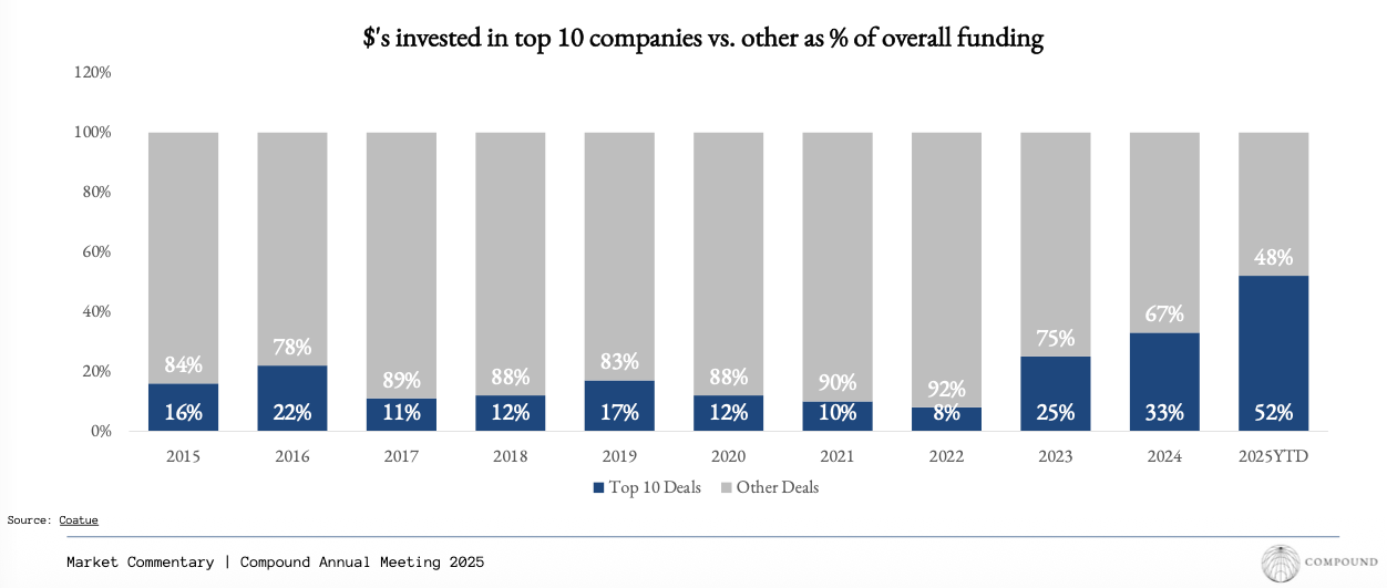 When the institutional machine needs to deploy billions of dollars, it indexes toward ideas that Make Total Sense in the few themes in the tech zeitgeist at any given moment. And thus the ecosystem orients itself to produce a steady stream of companies that are legible and reasonable enough in a Monday partner meeting, all in an effort to bring passive allocation to private tech markets and then deploy into the 10 best companies with the vast majority of capital in the industry.4